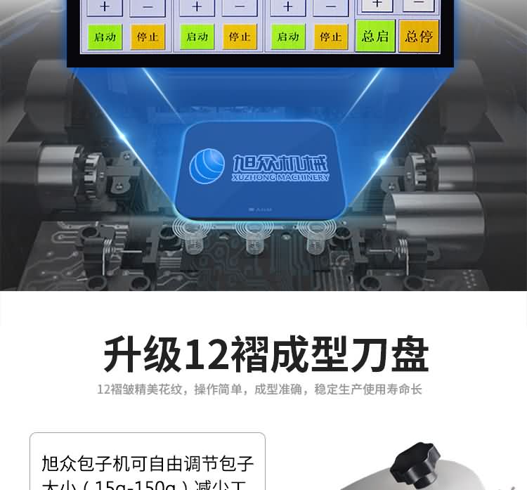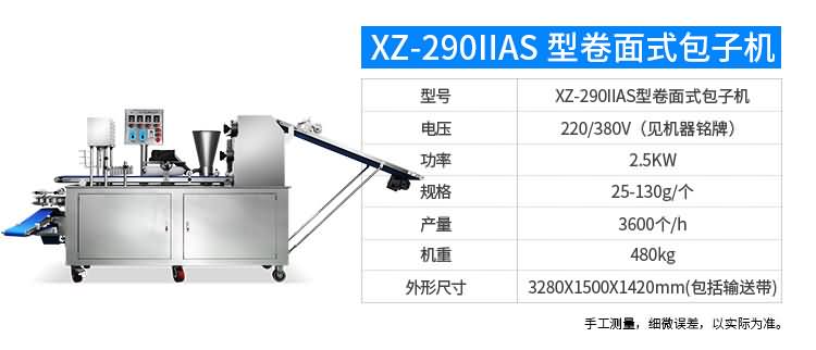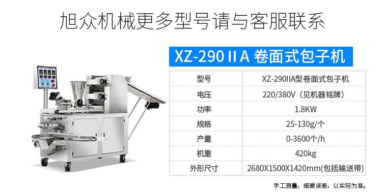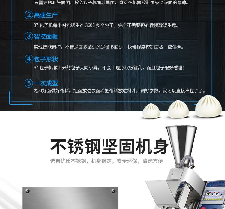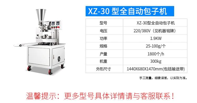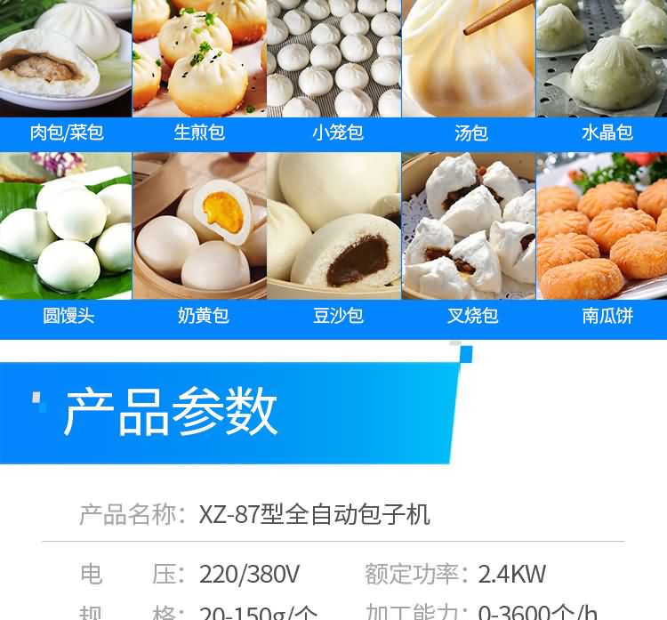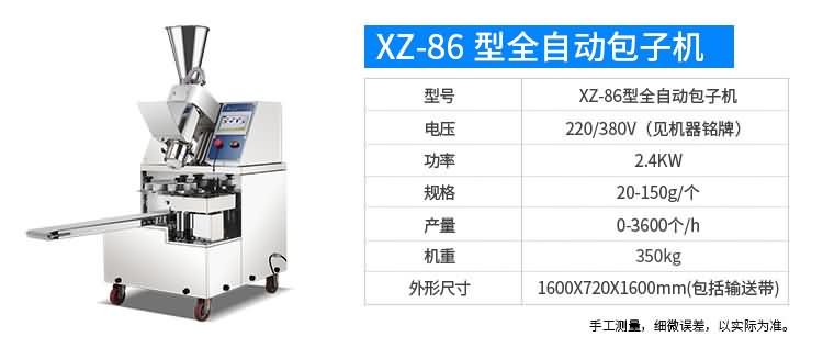 XZ-87型全自動(dòng)包子機(jī)體積小重量輕,不銹鋼的外殼及食品接觸面,外觀精美,花紋更多,設(shè)計(jì)先進(jìn),生產(chǎn)性能穩(wěn)定精準(zhǔn),結(jié)構(gòu)簡(jiǎn)單,操作方便??缮a(chǎn)各種肉包、肉菜包、菜包、小籠包、湯包、水晶包、圓饅頭、奶黃包、豆沙包、叉燒包、南瓜餅等幾十種包餡制品。